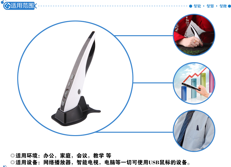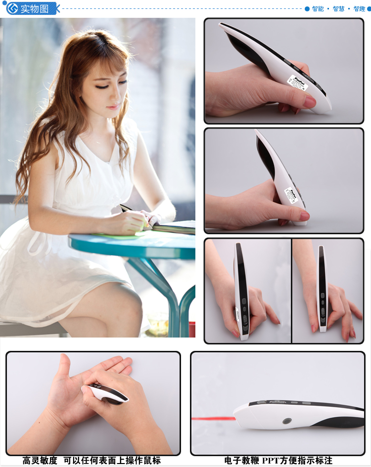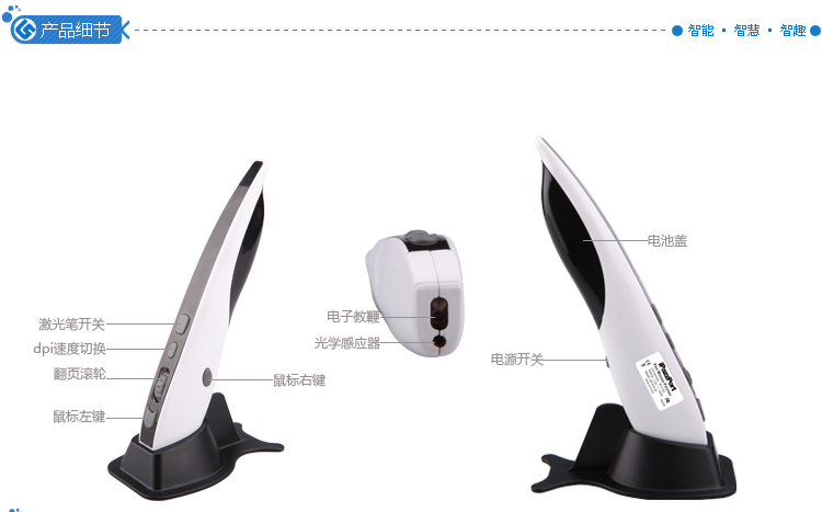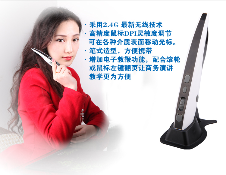 -2.4G无线连接, -人性化的手写输入姿态设计 -高精度,可调节分辩率 -时尚,精巧,舒适 -可拆卸电池,长时间待机 -内置激光笔 |