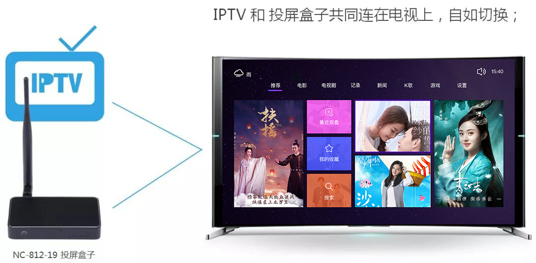 王燕继续摸索,发现这个盒子不简单,功能远远超出她的想象。联力胜投屏盒子与IPTV结合,大大拓展了原来机顶盒的内容。只需一键切换,既可以看到IPTV的内容,又可以看到手机端腾讯、优酷、爱奇艺、沃视频、天翼视讯、咪咕视屏的内容。退出手机投屏使用时,电视自动切换到IPTV界面,手机再次启用投屏功能时,画面也自动切换到投屏画面,两者实现了自由切换。